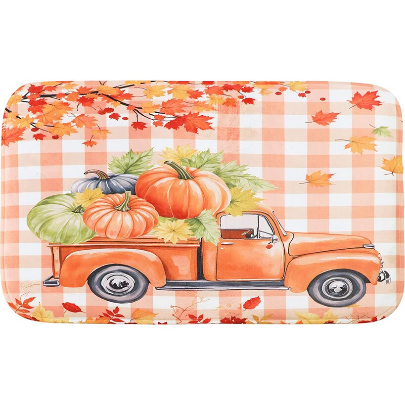 Give your bathroom decor the feel of a cozy autumn retreat with the 16-Pc. Pumpkin Truck Bath Set. This complete bath set features a delightful pumpkin truck design, bringing a rustic fall charm to your decor. From a plush memory foam contour and bath rug to a charming shower curtain with curtain rod rings and a festive toilet seat cover, this all-in-one bathroom set has everything you need to create a warm and inviting space. Toilet seat cover fits standard toilets only.