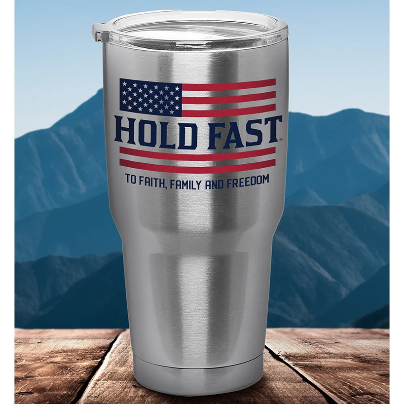 30‑Oz. Hold Fast American Flag Tumbler brings a bold patriotic touch to your daily routine with its striking stars‑and‑stripes design. American flag tumbler features durable stainless steel construction and vacuum‑sealed insulation that keeps beverages hot or cold for hours. Its convenient slide lid and travel‑friendly shape make it an ideal companion for work, errands, or outdoor adventures. This piece of patriotic drinkware is a sturdy, insulated travel tumbler that reflects your pride.Â