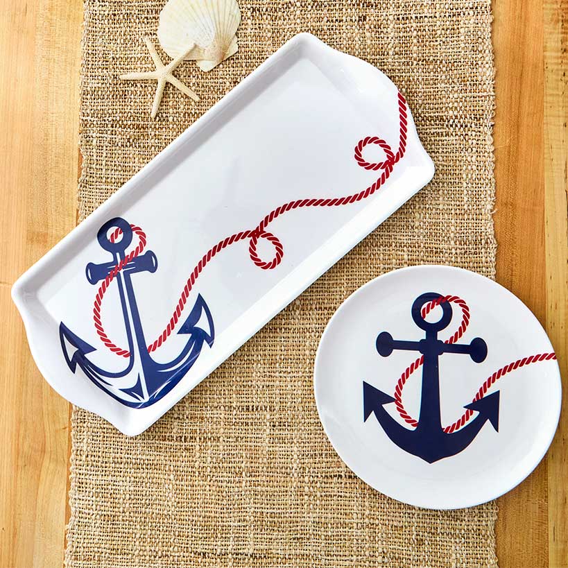 Anchors Away Dinnerware brings a touch of timeless maritime charm to your lake house dining table. The design of each piece includes a graceful anchor and a sailor's trusty rope, all done in red, white, and blue. Start with the Set of 4 Salad Plates and Set of 4 Dinner Plates, then fill the 15" Serving Platter with a main course or appetizers.