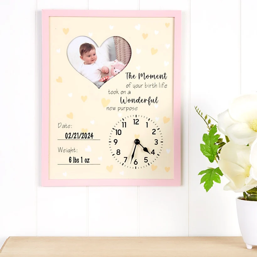 Celebrate the moment your world changed forever with the Baby is Born Frame. This charming baby keepsake beautifully captures the magic of your baby’s arrival in a single, stunning display. Available in Blue, Pink, and White. Customize it with a cherished photo alongside your baby’s birthdate and weight for a truly personal touch. Adjust the clock hands to mark the exact moment they were born, preserving that instant in time forever.