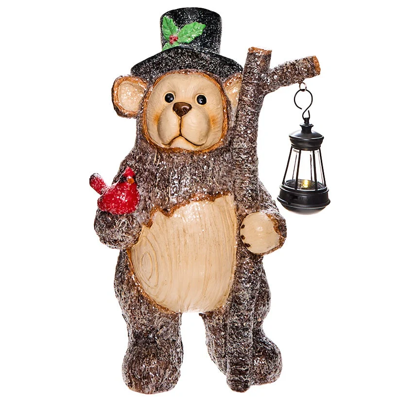 Bear Statue with Solar Lantern is a bit of true holiday spirit! This holiday decor guides the way on winter evenings with a classic solar lantern. The bear is accompanied by his cardinal friend, and he wears a jaunty top hat decorated with holly. It's a great piece for that spot next to your front door or mailbox.