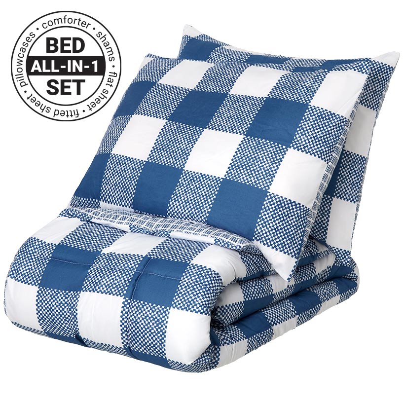 Blue Plaid Reversible Queen or King Complete Comforter Set gives you 2 cozy looks in 1 all-inclusive collection. This set comes with everything you need--just add pillows. Fluffy and warm, the comforter reverses from a large print plaid to a more delicate plaid print to give you 2 looks. The sheets and pillowcases feature the smaller plaid pattern, while the shams have the larger print. Vibrant blue shades on white make it easy to coordinate this set with other pieces of decor.