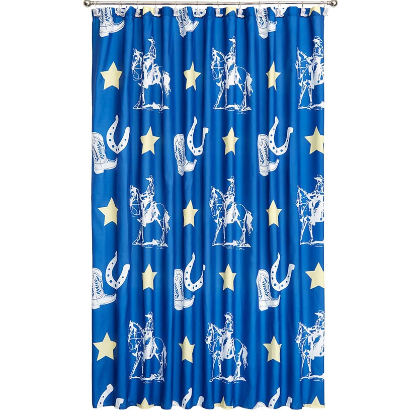 Buckaroo Cowboy Shower Curtain, Bath Rug, Set of 2 Hand Towels, Valance or Set of 12 Hooks are a complete bathroom renovation at an incredible value. The Set of 2 Hand Towels features beautiful embroidered cowboy boots. Hang the blue, white and yellow Shower Curtain with the coordinating white and blue cowboy boot Set of 12 Shower Curtain Hooks. Memory Foam Rug features an non-slip backing to prevent accidents. The Valance is easy to install with a rod pocket.