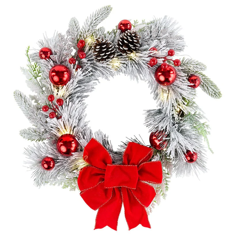 Christmas Frosted Pine with Red Bows Decor is a complete makeover for your holiday home! These sparkling pieces make creating a beautiful Christmas look easy and affordable. Frosted evergreens and pinecones are highlighted by red accents and bows. Warm LEDs give them a glow that is pure Winter magic. Combine the Wreath, Centerpiece, Swag, and Stair Swag, and your home will be ready for guests in just minutes.