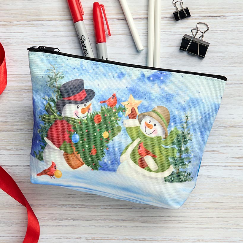 Christmas Zipper Pouch is a festive holiday organization during the whirlwind Christmas season. Zippered pouch has a vibrant screen-printed scene on the front that fits in with the rest of your holiday accessories. Select from Snowman and Gingerbread. Great for storing pencils, cosmetics, gift wrapping essentials and more!