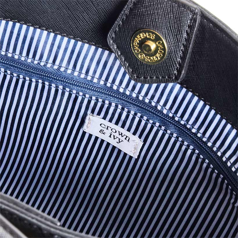 Sophisticated Crown & Ivy Black Purse is ready to elevate any outfit and make your daily routine a breeze. This chic bag offers a unique dual-closure system, allowing you to easily organize and access your essentials. One side features a secure bar lock closure, while the other boasts a convenient magnetic snap/button closure, giving you flexibility on the go. Inside, you'll find 2 open side pockets and a zippered pocket for added organization, plus an outside open pocket for quick access to your phone or keys. The purse also features a versatile shoulder strap that can be adjusted for the perfect fit or removed entirely for a sleek, handheld look.