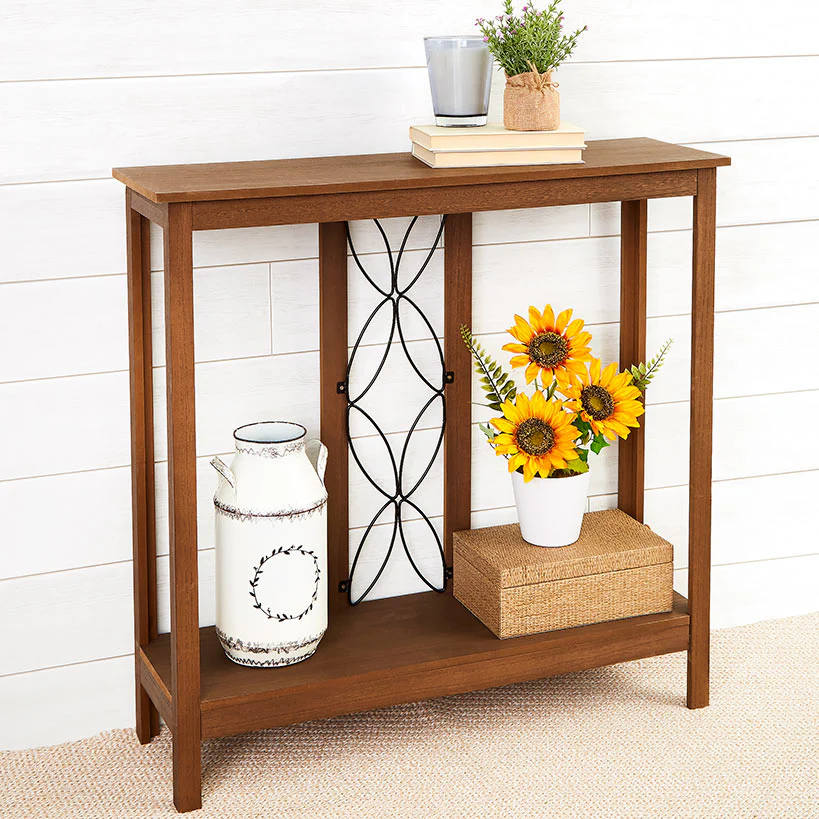 Decorate with the sophistication of a Decorative Wooden Console Table with Metal Scroll Accent or 2-Tier Matching Shelf. Clean, simple lines are accented with graceful metalwork. 2-Tier Arch Wall Shelf shows off your favorite pieces of decor and collectibles. Tuck the Console Table behind a sofa for a little storage or use it in an entryway.