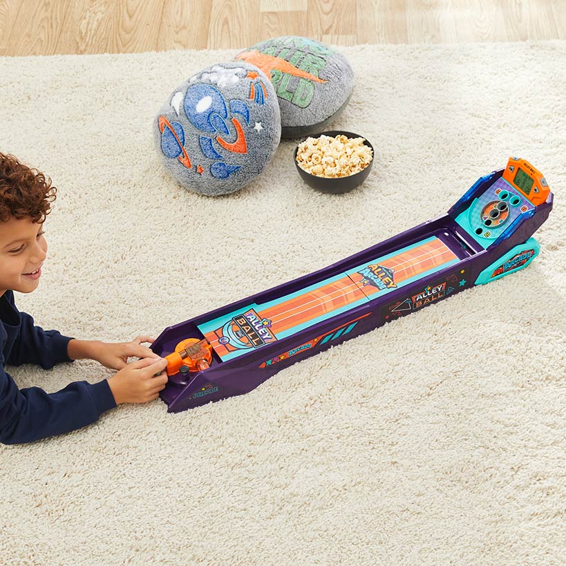 Electronic Alley Arcade Game really gets the fun rolling! Shoot the ball down the alley, up the ramp and into the holes to score points. Lights and sound effects increase the excitement as the electronic score board keeps track of your tally. Turn on 2-player mode and see who wins. Suction cups on the bottom keep the alley in place while you play. Includes 6 yellow and 6 blue balls. Adjustable volume.